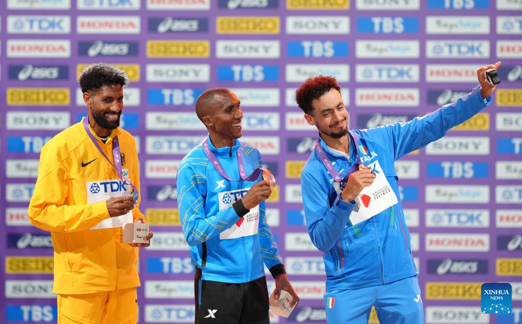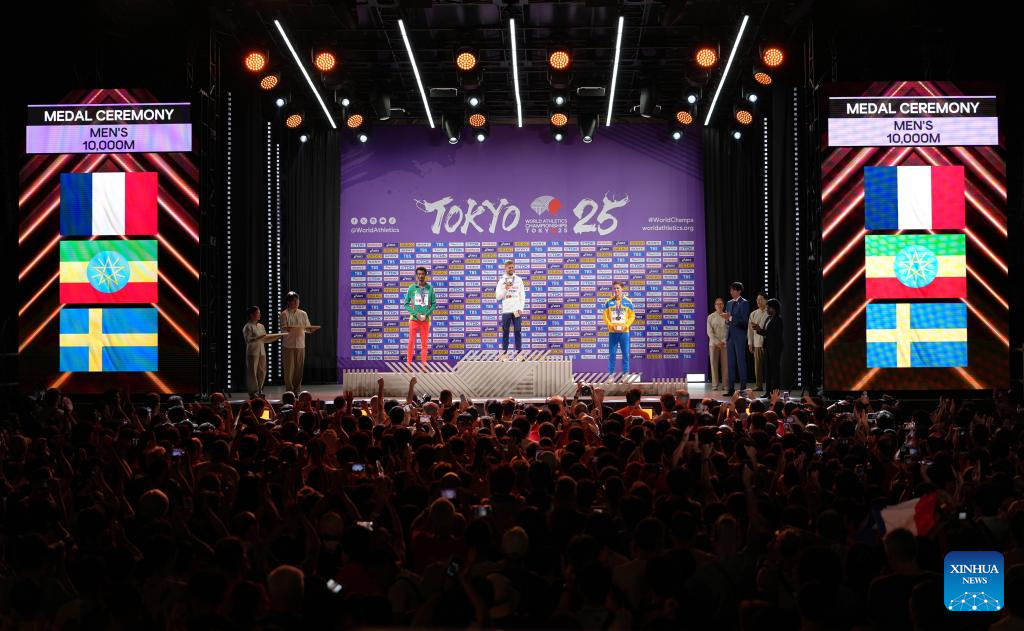 Gold medalist Jimmy Gressier (C) of France, silver medalist Yomif Kejelcha (L) of Ethiopia and bronze medalist Andreas Almgren of Sweden pose during the men's 10000m awarding ceremony at the 2025 World Athletics Championships in Tokyo, Japan, Sept. 15, 2025. (Xinhua/Ju Huanzong)