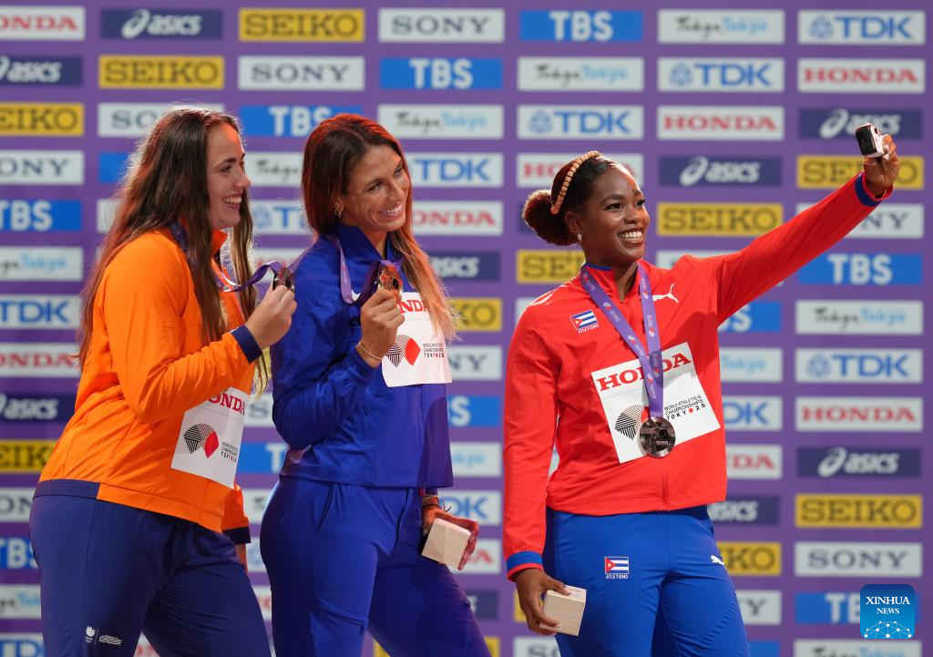 Gold medalist Valarie Allman (C) of the United States, silver medalist Jorinde Van Klinken (L) of the Netherlands and bronze medalist Silinda Morales of Cuba take a selfie during the women's discus throw awarding ceremony at the 2025 World Athletics Championships in Tokyo, Japan, Sept. 15, 2025. (Xinhua/Ju Huanzong)