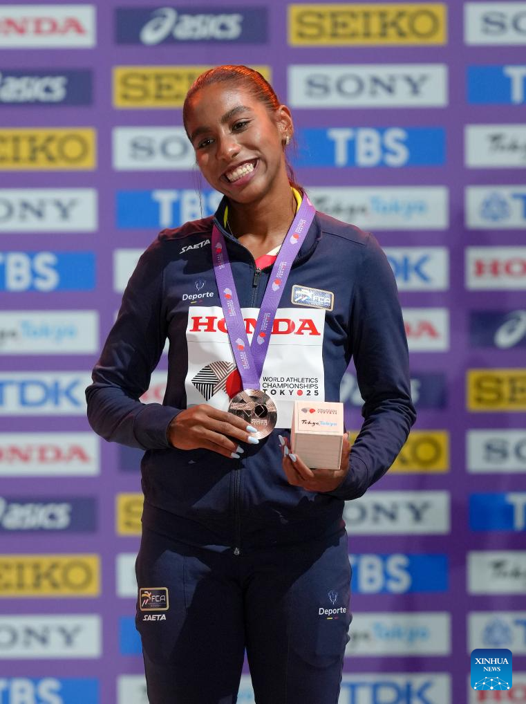 Bronze medalist Natalia Linares of Colombia is seen during the women's long jump awarding ceremony at the 2025 World Athletics Championships in Tokyo, Japan, Sept. 15, 2025. (Xinhua/Ju Huanzong)