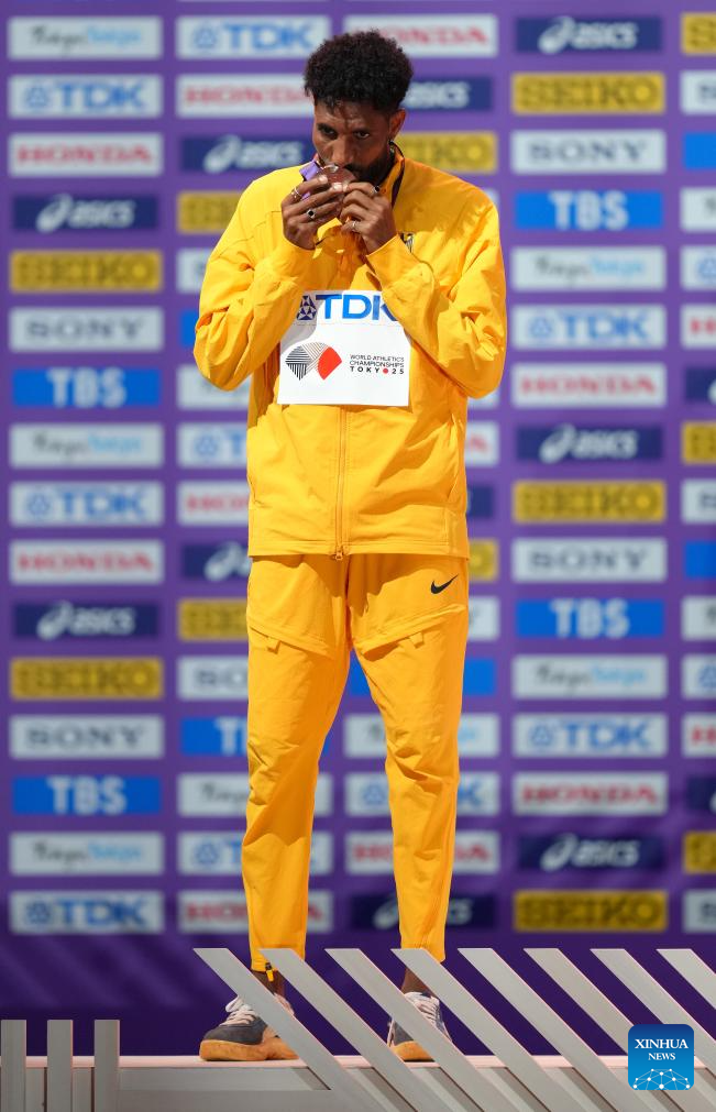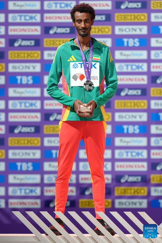 Silver medalist Yomif Kejelcha of Ethiopia poses during the men's 10000m awarding ceremony at the 2025 World Athletics Championships in Tokyo, Japan, Sept. 15, 2025. (Xinhua/Ju Huanzong)