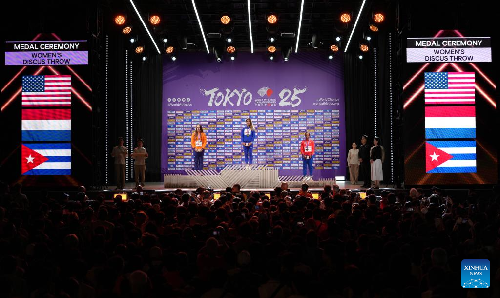 Gold medalist Valarie Allman (C) of the United States, silver medalist Jorinde Van Klinken (L) of the Netherlands and bronze medalist Silinda Morales of Cuba pose during the women's discus throw awarding ceremony at the 2025 World Athletics Championships in Tokyo, Japan, Sept. 15, 2025. (Xinhua/Ju Huanzong)