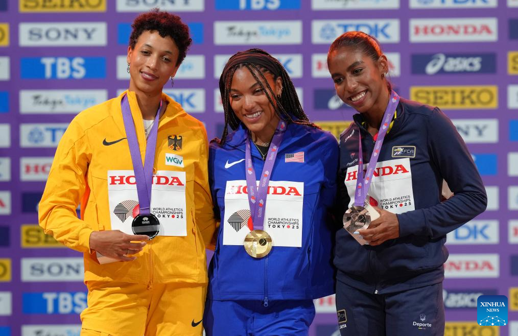 Gold medalist Tara Davis-Woodhall (C) of the United States, silver medalist Malaika Mihambo (L) of Germany and bronze medalist Natalia Linares of Colombia pose during the women's long jump awarding ceremony at the 2025 World Athletics Championships in Tokyo, Japan, Sept. 15, 2025. (Xinhua/Ju Huanzong)