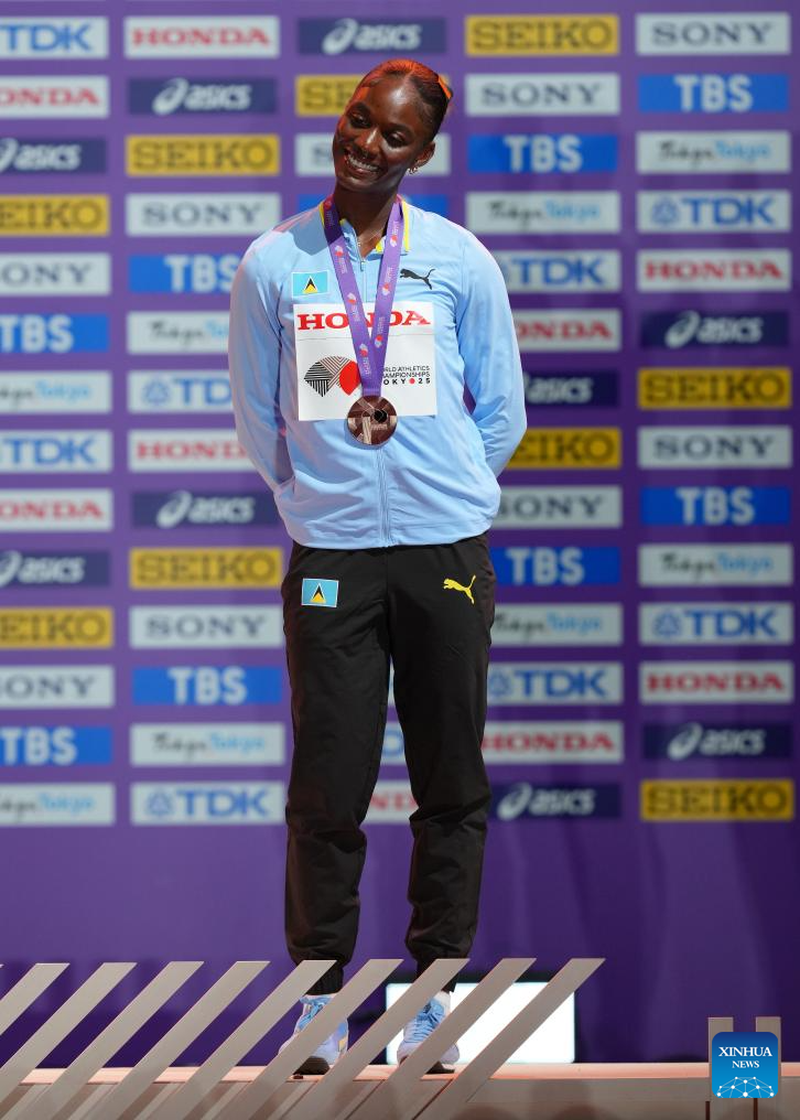 Bronze medalist Julien Alfred of Saint Lucia is seen during the women's 100m awarding ceremony at the 2025 World Athletics Championships in Tokyo, Japan, Sept. 15, 2025. (Xinhua/Ju Huanzong)