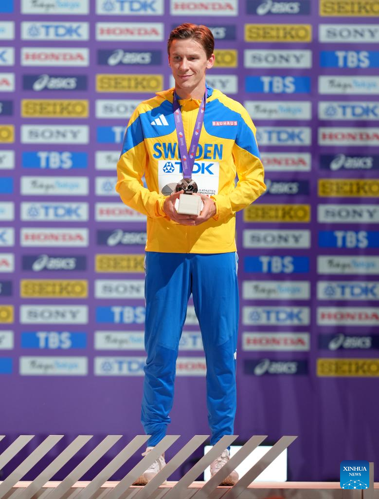 Bronze medalist Andreas Almgren of Sweden poses during the men's 10000m awarding ceremony at the 2025 World Athletics Championships in Tokyo, Japan, Sept. 15, 2025. (Xinhua/Ju Huanzong)