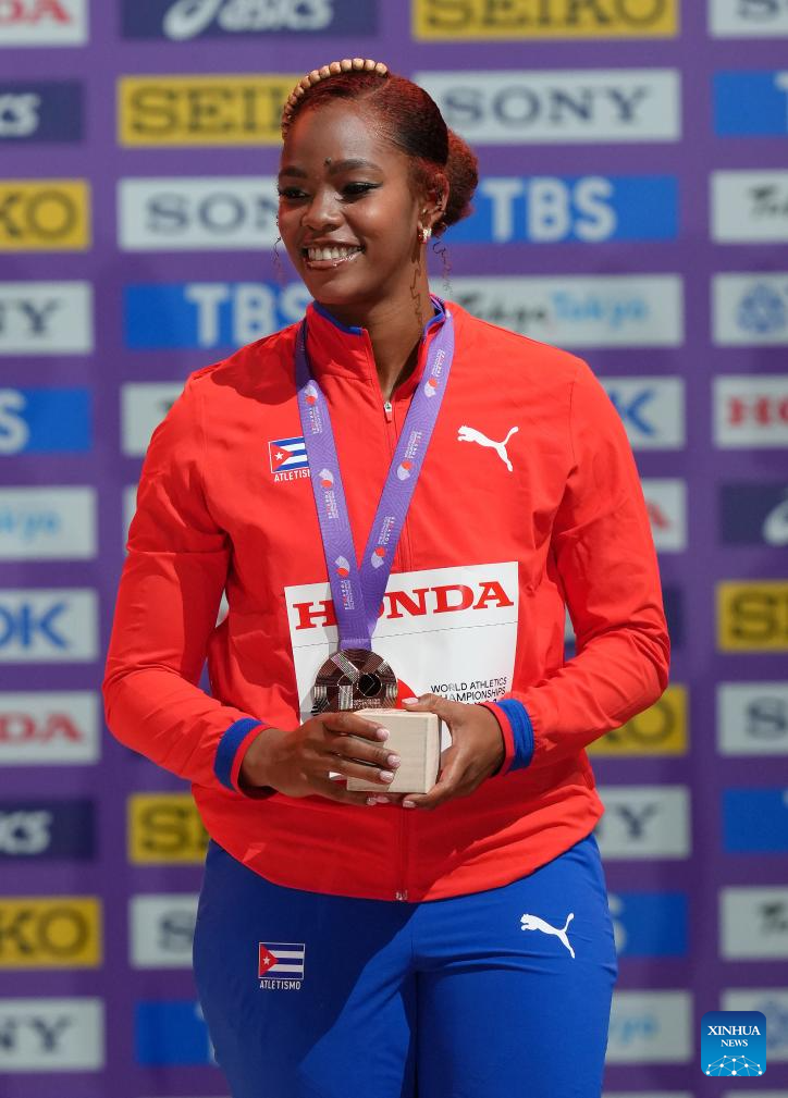 Bronze medalist Silinda Morales of Cuba is seen during the women's discus throw awarding ceremony at the 2025 World Athletics Championships in Tokyo, Japan, Sept. 15, 2025. (Xinhua/Ju Huanzong)