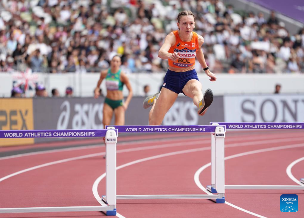 Femke Bol (R) of the Netherlands competes during the women's 400m hurdles heat at the 2025 World Athletics Championships in Tokyo, Japan, Sept. 15, 2025. (Xinhua/Jiang Han)