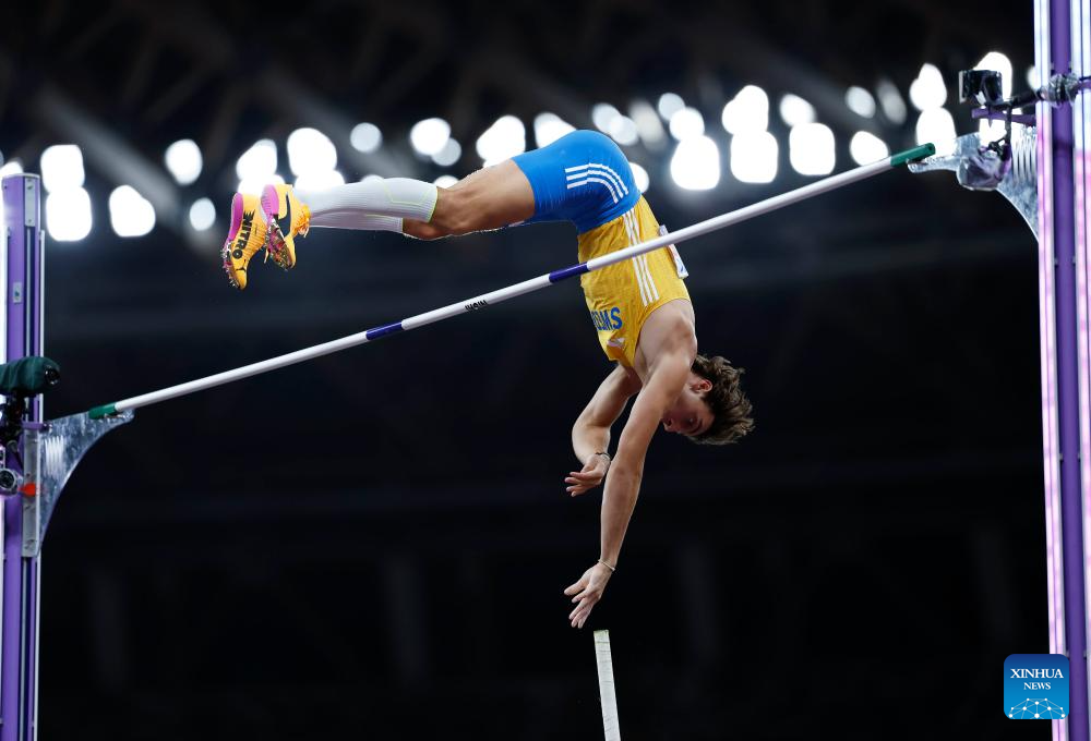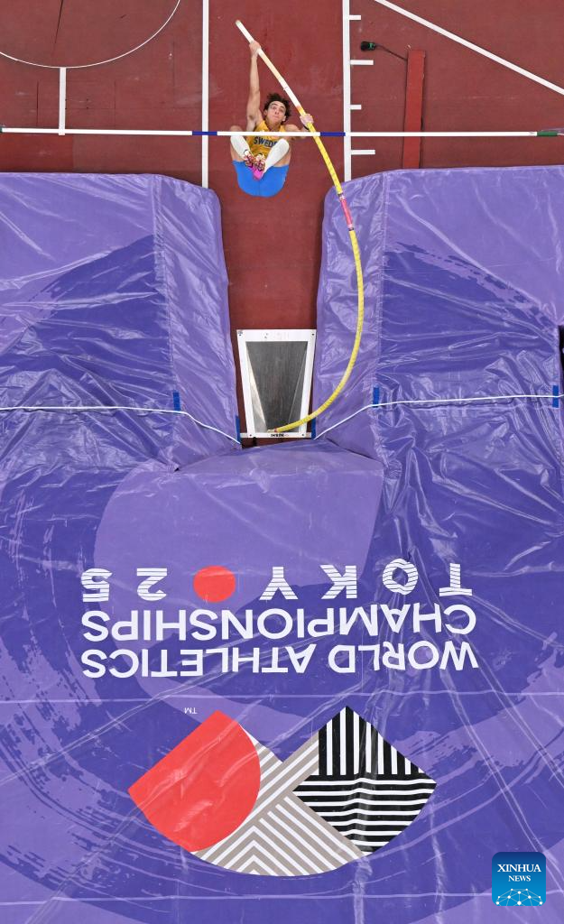 Armand Duplantis of Sweden competes during the men's pole vault final at the 2025 World Athletics Championships in Tokyo, Japan, Sept. 15, 2025. (Xinhua/Lui Siu Wai)