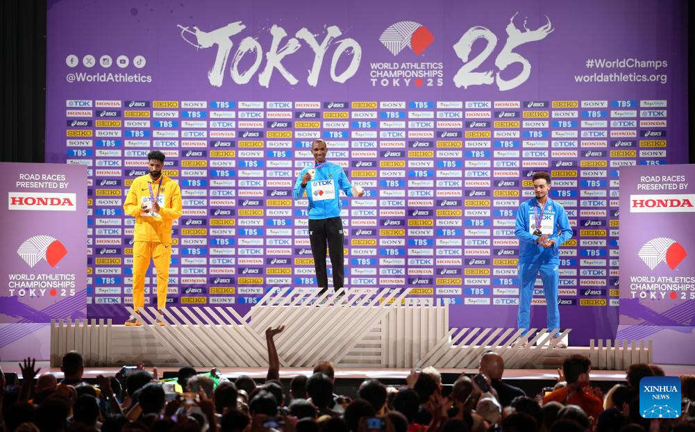 Gold medalist Alphonce Felix Simbu (C) of Tanzania, silver medalist Amanal Petros (L) of Germany and bronze medalist Iliass Aouani of Italy pose during the men's marathon awarding ceremony at the 2025 World Athletics Championships in Tokyo, Japan, Sept. 15, 2025. (Xinhua/Ju Huanzong)