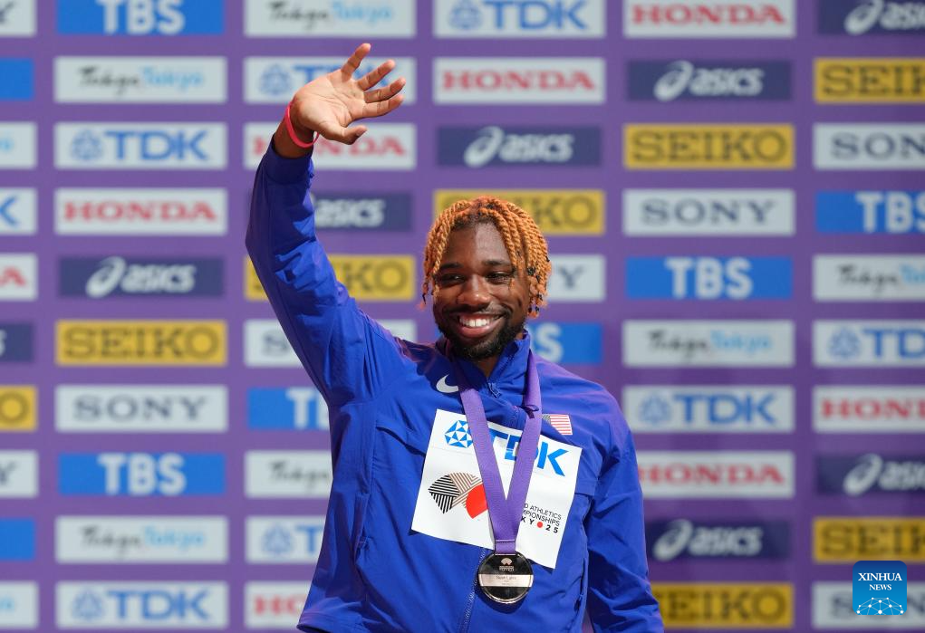 Bronze medalist Noah Lyles of the United States poses during the men's 100m awarding ceremony at the 2025 World Athletics Championships in Tokyo, Japan, Sept. 15, 2025. (Xinhua/Ju Huanzong)