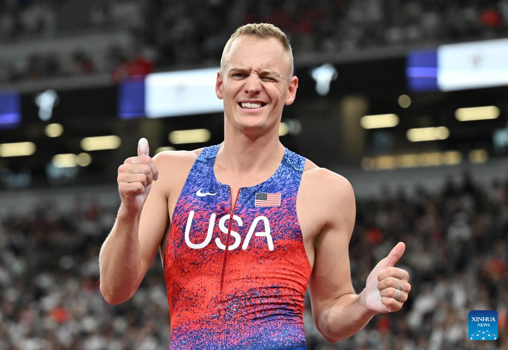 Sam Kendricks of the United States reacts during the men's pole vault final at the 2025 World Athletics Championships in Tokyo, Japan, Sept. 15, 2025. (Xinhua/Song Yanhua)