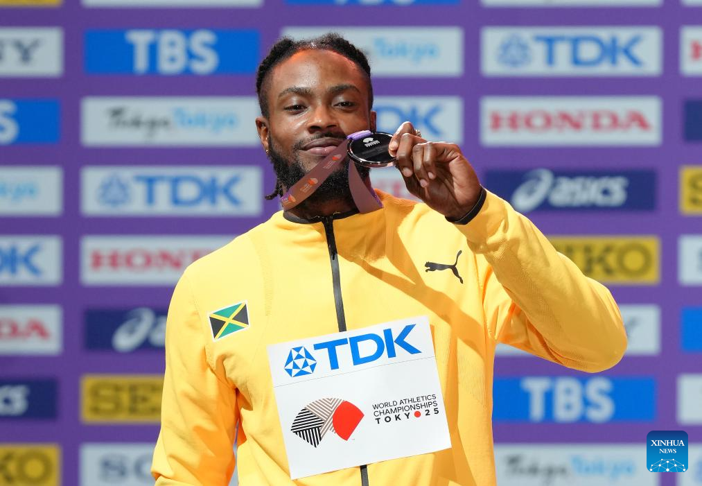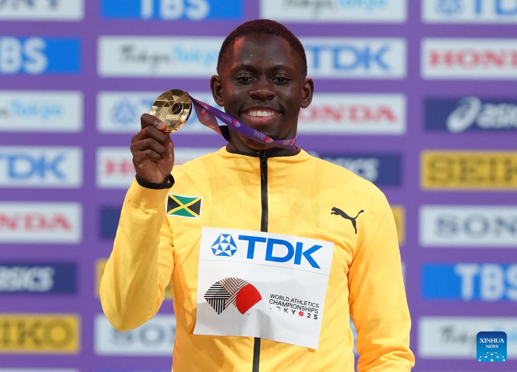 Gold medalist Oblique Seville of Jamaica poses during the men's 100m awarding ceremony at the 2025 World Athletics Championships in Tokyo, Japan, Sept. 15, 2025. (Xinhua/Ju Huanzong)