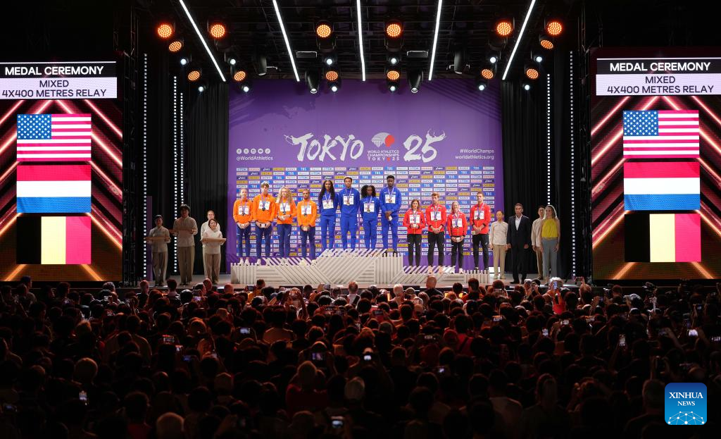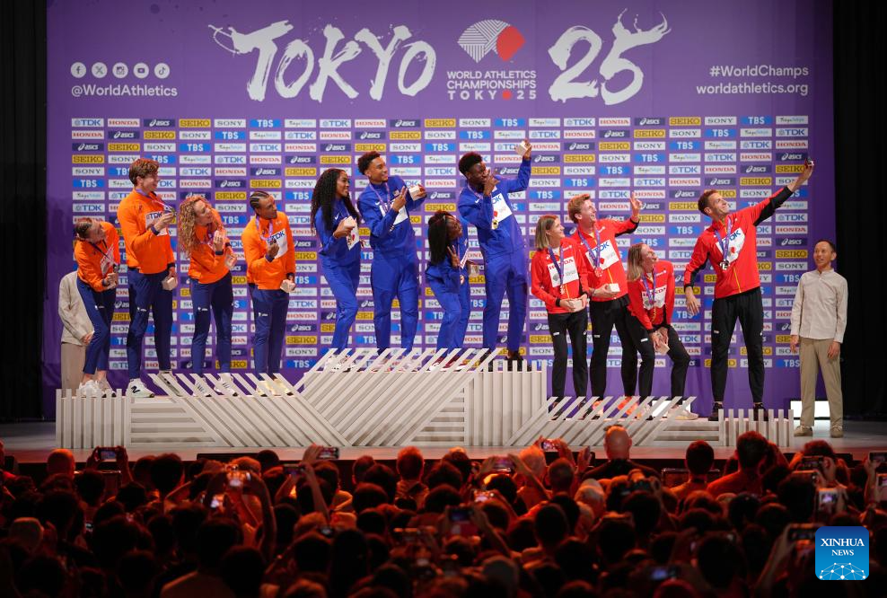 Gold medalists team of the United States (C), silver medalists team of the Netherlands (L) and bronze medalists team of Belgium pose during the mixed 4x400m relay awarding ceremony at the 2025 World Athletics Championships in Tokyo, Japan, Sept. 15, 2025. (Xinhua/Ju Huanzong)