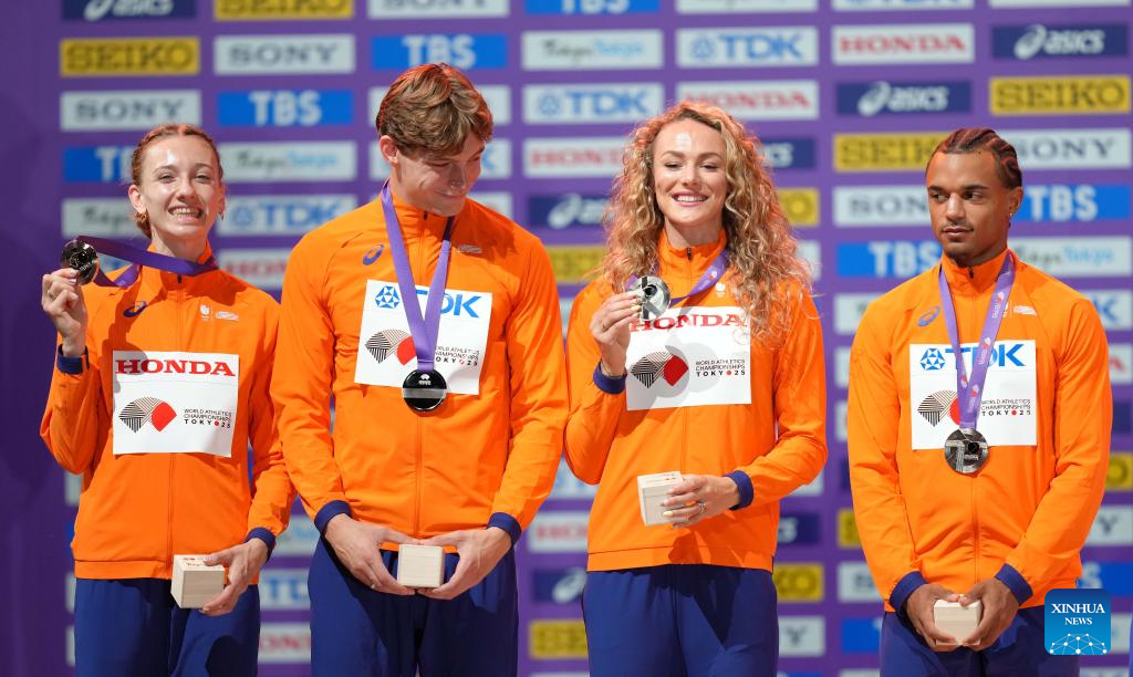Silver medalists Femke Bol, Jonas Phijffers, Lieke Klaver and Eugene Omalla (L-R) of the Netherlands are seen during the mixed 4x400m relay awarding ceremony at the 2025 World Athletics Championships in Tokyo, Japan, Sept. 15, 2025. (Xinhua/Ju Huanzong)