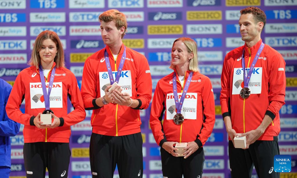 Bronze medalists Helena Ponette, Alexander Doom, Imke Vervaet and Dylan Borlee (L-R) of Belgium are seen during the mixed 4x400m relay awarding ceremony at the 2025 World Athletics Championships in Tokyo, Japan, Sept. 15, 2025. (Xinhua/Ju Huanzong)