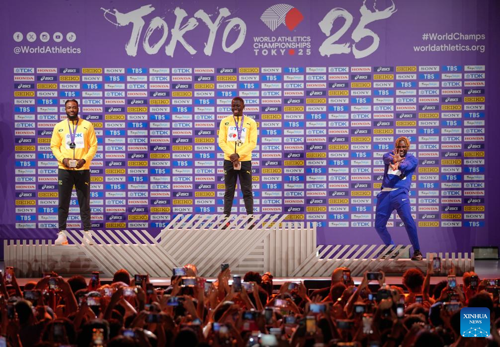 Gold medalist Oblique Seville (C) of Jamaica, silver medalist Kishane Thompson (L) of Jamaica and bronze medalist Noah Lyles of the United States pose during the men's 100m awarding ceremony at the 2025 World Athletics Championships in Tokyo, Japan, Sept. 15, 2025. (Xinhua/Ju Huanzong)