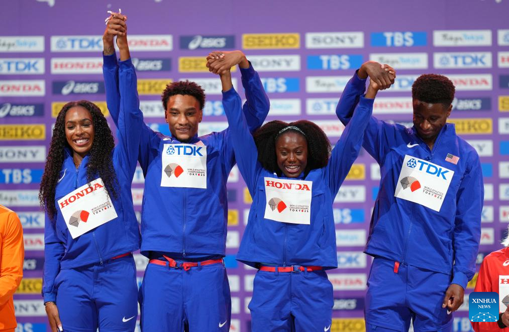 Gold medalists Alexis Holmes, Jenoah Mckiver, Lynna Irby-Jackson and Bryce Deadmon (L-R) of the United States are seen during the mixed 4x400m relay awarding ceremony at the 2025 World Athletics Championships in Tokyo, Japan, Sept. 15, 2025. (Xinhua/Ju Huanzong)