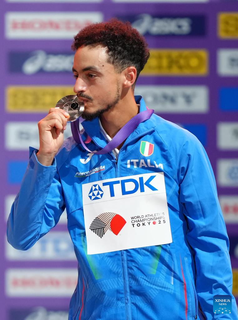 Bronze medalist Iliass Aouani of Italy kisses the medal during the men's marathon awarding ceremony at the 2025 World Athletics Championships in Tokyo, Japan, Sept. 15, 2025. (Xinhua/Ju Huanzong)