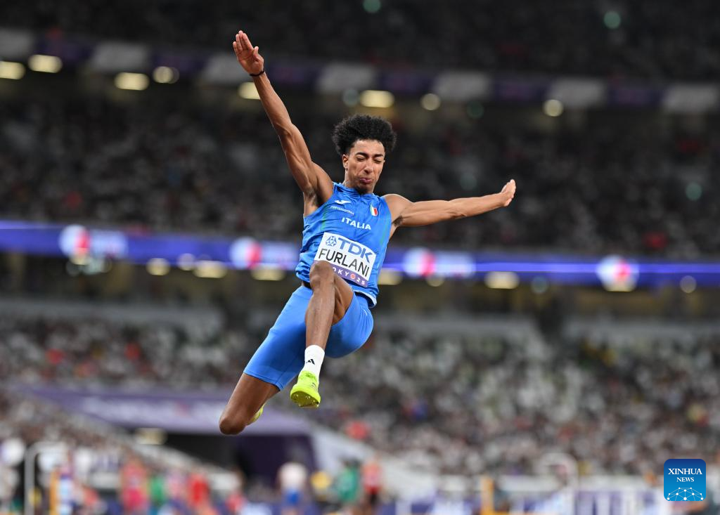 Mattia Furlani of Italy competes during the men's long jump qualification at the 2025 World Athletics Championships in Tokyo, Japan, Sept. 15, 2025. (Xinhua/Song Yanhua)