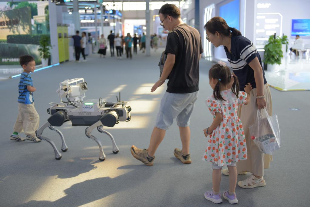 In the outdoor exhibition area, robotic arms can be seen assisting people in making coffee, while quadruped robotic dogs perform tour-guiding tasks or simply roam around.