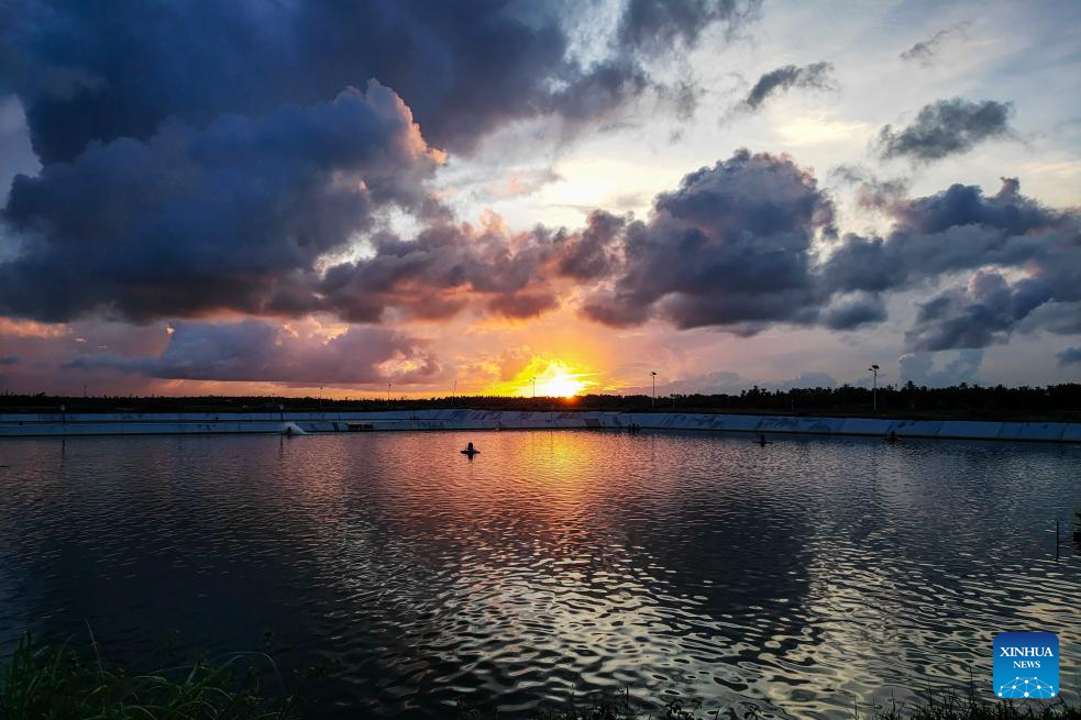 This photo taken on Aug. 31, 2025 shows a view of fish ponds at sunset in Jiamei Village, Wenchang City, south China's Hainan Province. In recent years, Jiamei Village of Hainan Province has been advancing its rural revitalization. The village has developed industries such as cultural tourism, yellow cattle farming, fruit and vegetable cultivation, and aquaculture drawing on its rich history, culture and natural resources. In 2023, Jiamei Village was listed in the sixth batch of traditional Chinese villages catalog. (Xinhua/Pu Xiaoxu)