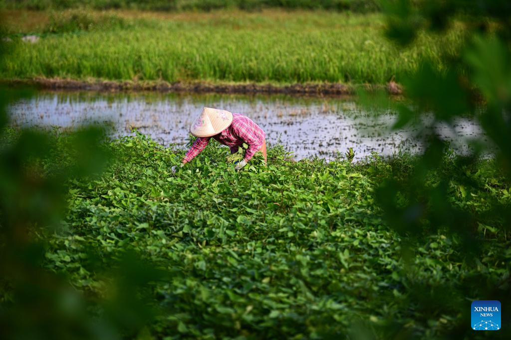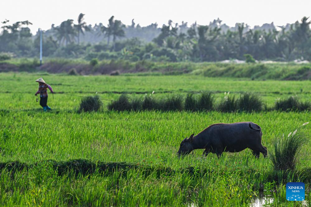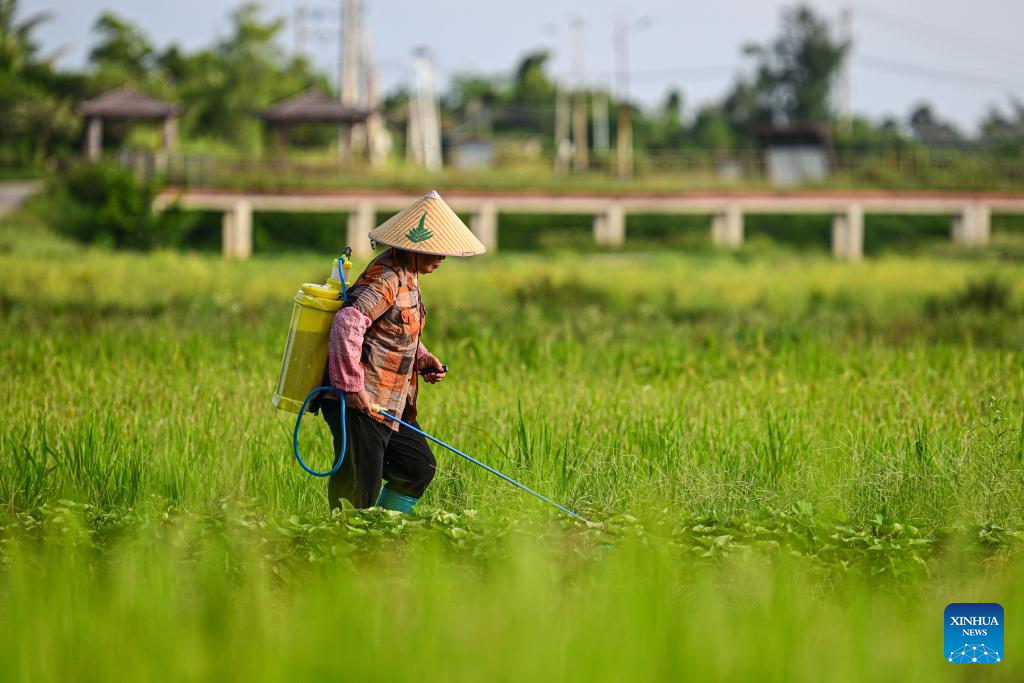 A villager works in the fields in Jiamei Village, Wenchang City, south China's Hainan Province, Sept. 9, 2025. In recent years, Jiamei Village of Hainan Province has been advancing its rural revitalization. The village has developed industries such as cultural tourism, yellow cattle farming, fruit and vegetable cultivation, and aquaculture drawing on its rich history, culture and natural resources. In 2023, Jiamei Village was listed in the sixth batch of traditional Chinese villages catalog. (Xinhua/Pu Xiaoxu)