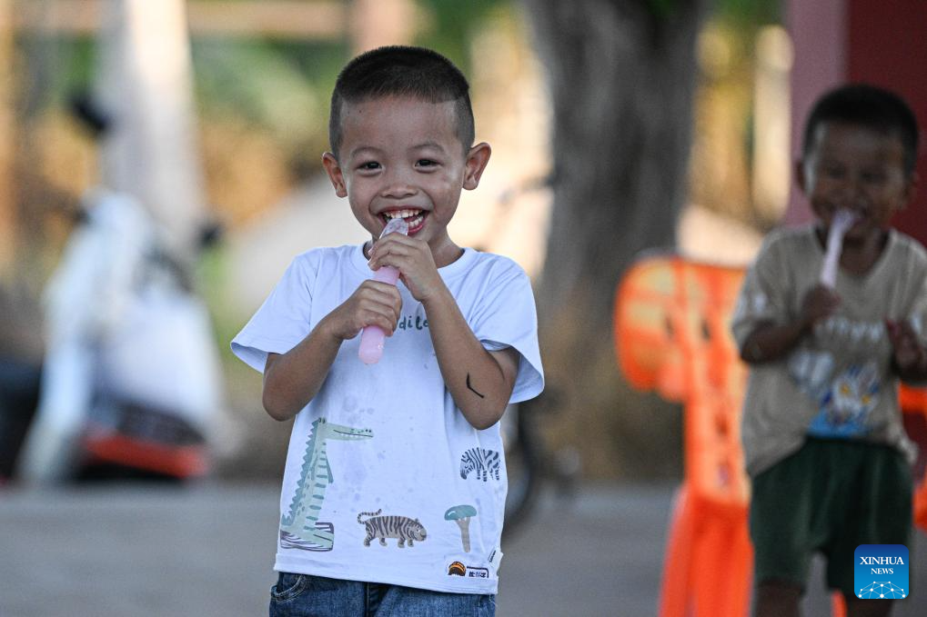 A child eats a popsicle in Jiamei Village, Wenchang City, south China's Hainan Province, Sept. 3, 2025. In recent years, Jiamei Village of Hainan Province has been advancing its rural revitalization. The village has developed industries such as cultural tourism, yellow cattle farming, fruit and vegetable cultivation, and aquaculture drawing on its rich history, culture and natural resources. In 2023, Jiamei Village was listed in the sixth batch of traditional Chinese villages catalog. (Xinhua/Pu Xiaoxu)