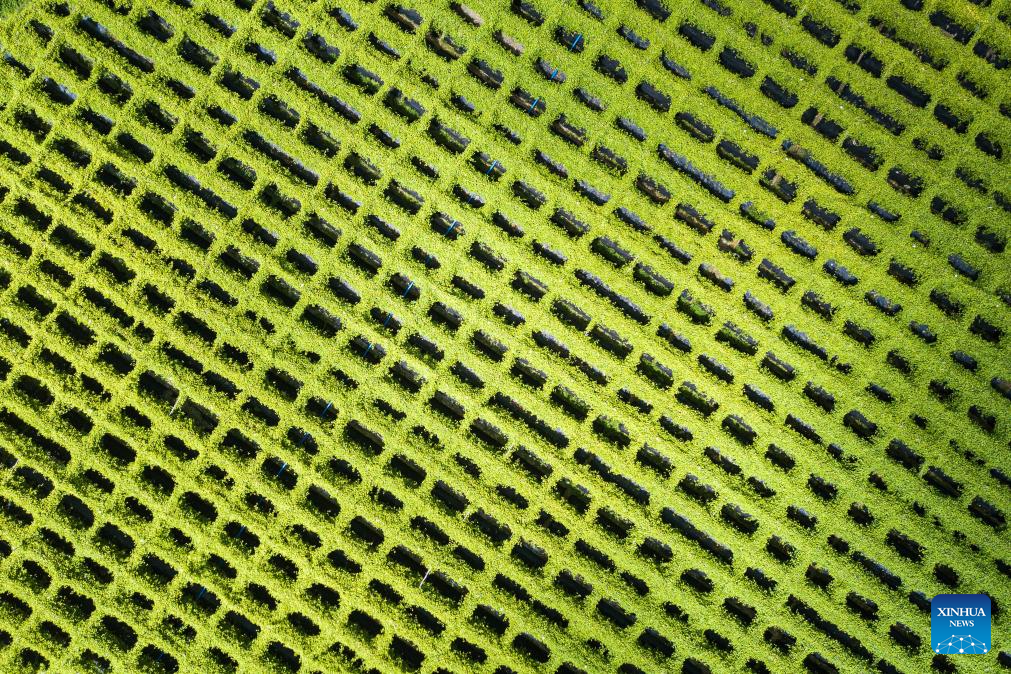 An aerial drone photo taken on Sept. 11, 2025 shows a passion fruit planting base in Jiamei Village, Wenchang City, south China's Hainan Province. In recent years, Jiamei Village of Hainan Province has been advancing its rural revitalization. The village has developed industries such as cultural tourism, yellow cattle farming, fruit and vegetable cultivation, and aquaculture drawing on its rich history, culture and natural resources. In 2023, Jiamei Village was listed in the sixth batch of traditional Chinese villages catalog. (Xinhua/Pu Xiaoxu)