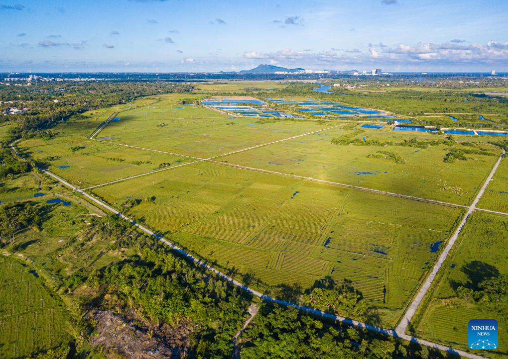 A drone photo taken on Sept. 11, 2025 shows fields in Jiamei Village, Wenchang City, south China's Hainan Province. In recent years, Jiamei Village of Hainan Province has been advancing its rural revitalization. The village has developed industries such as cultural tourism, yellow cattle farming, fruit and vegetable cultivation, and aquaculture drawing on its rich history, culture and natural resources. In 2023, Jiamei Village was listed in the sixth batch of traditional Chinese villages catalog. (Xinhua/Pu Xiaoxu)
