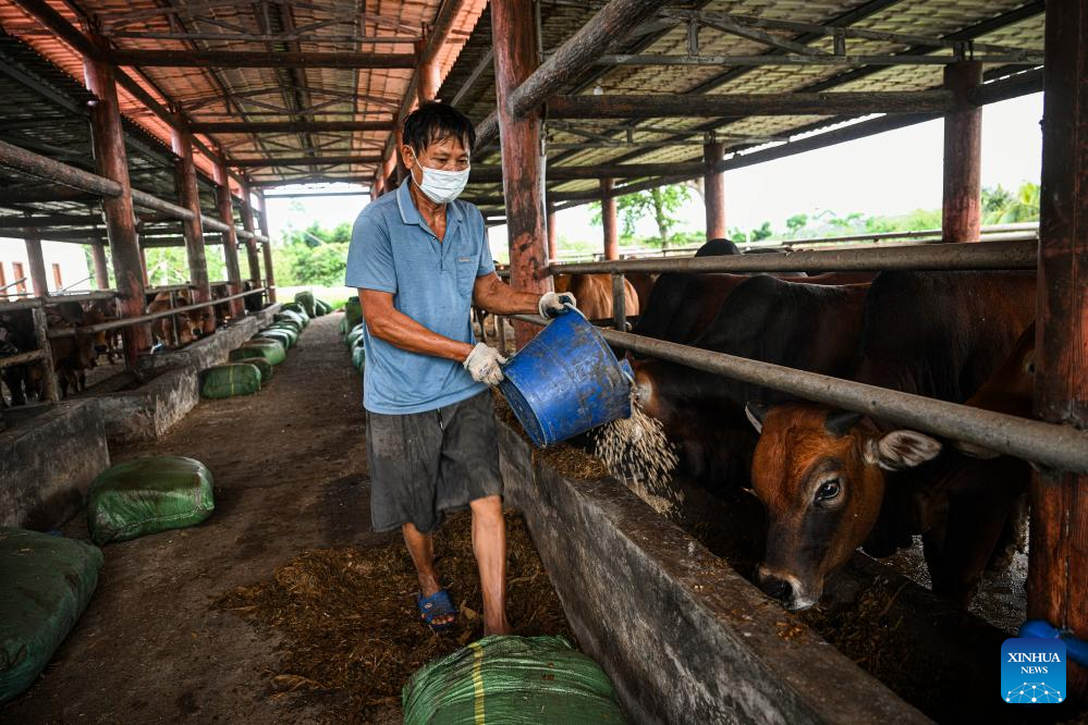 A villager feeds cattle at a fattening base in Jiamei Village, Wenchang City, south China's Hainan Province, Sept. 8, 2025. In recent years, Jiamei Village of Hainan Province has been advancing its rural revitalization. The village has developed industries such as cultural tourism, yellow cattle farming, fruit and vegetable cultivation, and aquaculture drawing on its rich history, culture and natural resources. In 2023, Jiamei Village was listed in the sixth batch of traditional Chinese villages catalog. (Xinhua/Pu Xiaoxu)