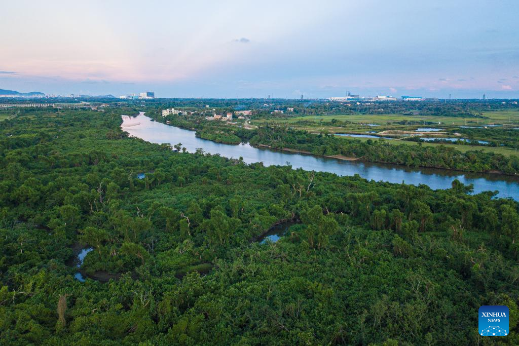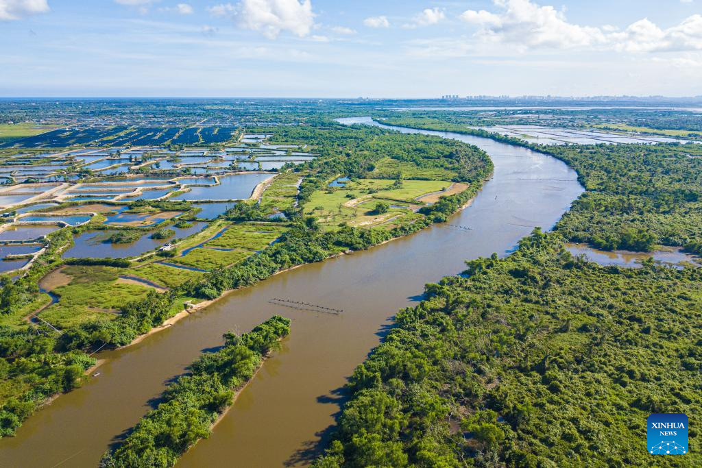 A drone photo taken on Sept. 3, 2025 shows a view of Wenjiao River beside Jiamei Village, Wenchang City, south China's Hainan Province. In recent years, Jiamei Village of Hainan Province has been advancing its rural revitalization. The village has developed industries such as cultural tourism, yellow cattle farming, fruit and vegetable cultivation, and aquaculture drawing on its rich history, culture and natural resources. In 2023, Jiamei Village was listed in the sixth batch of traditional Chinese villages catalog. (Xinhua/Pu Xiaoxu)