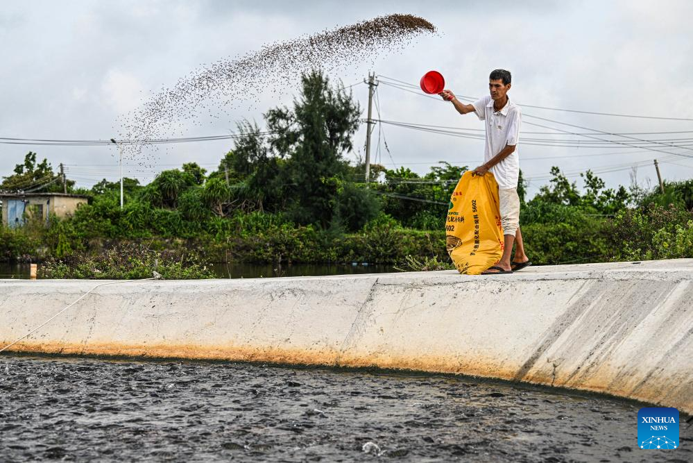 A villager feeds fish in a breeding pond in Jiamei Village, Wenchang City, south China's Hainan Province, Sept. 8, 2025. In recent years, Jiamei Village of Hainan Province has been advancing its rural revitalization. The village has developed industries such as cultural tourism, yellow cattle farming, fruit and vegetable cultivation, and aquaculture drawing on its rich history, culture and natural resources. In 2023, Jiamei Village was listed in the sixth batch of traditional Chinese villages catalog. (Xinhua/Pu Xiaoxu)