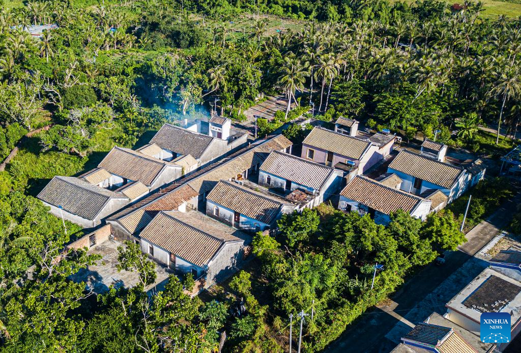 A drone photo taken on Sept. 11, 2025 shows a view of traditional houses in Jiamei Village, Wenchang City, south China's Hainan Province. In recent years, Jiamei Village of Hainan Province has been advancing its rural revitalization. The village has developed industries such as cultural tourism, yellow cattle farming, fruit and vegetable cultivation, and aquaculture drawing on its rich history, culture and natural resources. In 2023, Jiamei Village was listed in the sixth batch of traditional Chinese villages catalog. (Xinhua/Pu Xiaoxu)