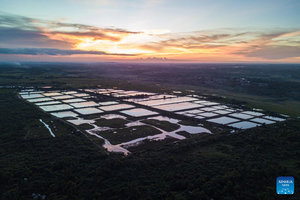 A drone photo taken on Sept. 3, 2025 shows a view of fish ponds at sunset in Jiamei Village, Wenchang City, south China's Hainan Province. In recent years, Jiamei Village of Hainan Province has been advancing its rural revitalization. The village has developed industries such as cultural tourism, yellow cattle farming, fruit and vegetable cultivation, and aquaculture drawing on its rich history, culture and natural resources. In 2023, Jiamei Village was listed in the sixth batch of traditional Chinese villages catalog. (Xinhua/Pu Xiaoxu)