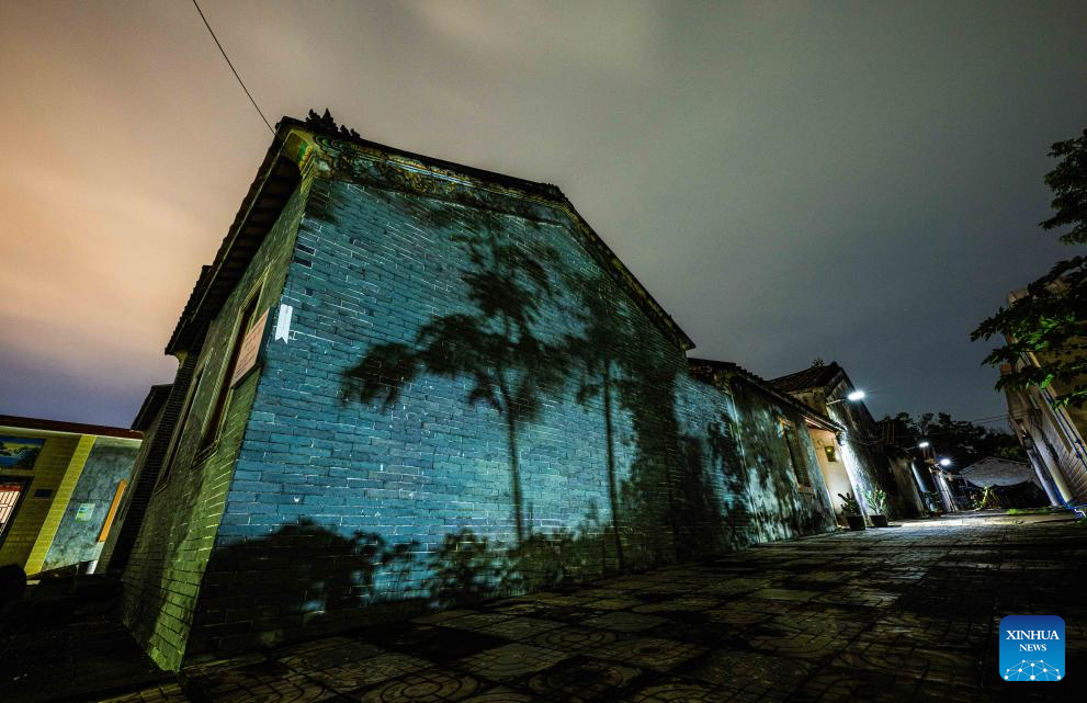 This photo taken on Sept. 10, 2025 shows the night view of Jiamei Village, Wenchang City, south China's Hainan Province. In recent years, Jiamei Village of Hainan Province has been advancing its rural revitalization. The village has developed industries such as cultural tourism, yellow cattle farming, fruit and vegetable cultivation, and aquaculture drawing on its rich history, culture and natural resources. In 2023, Jiamei Village was listed in the sixth batch of traditional Chinese villages catalog. (Xinhua/Pu Xiaoxu)