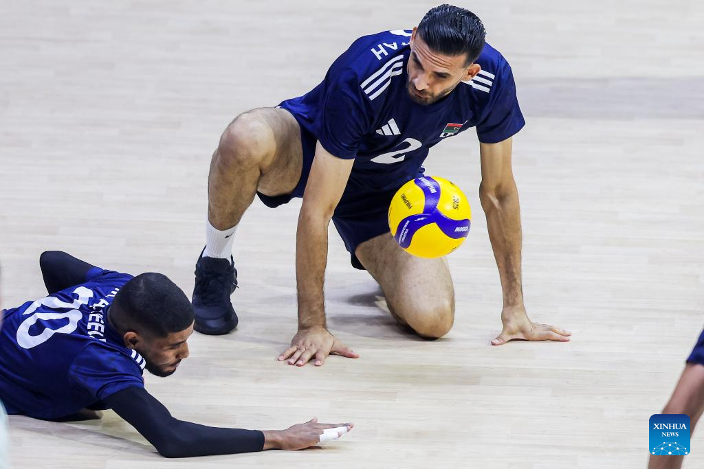 Mohammed Alajeeli (L) and Ali Jineefah of Libya compete during the pool G match between Türkiye and Libya at the FIVB Men's World Championship 2025 in Quezon City, the Philippines, on Sept. 15, 2025. (Xinhua/Rouelle Umali)