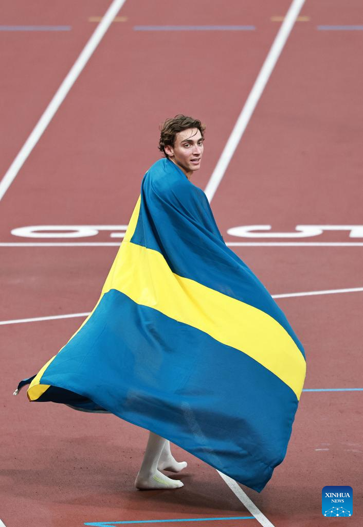 Gold medalist Armand Duplantis of Sweden celebrates after the men's pole vault final at the 2025 World Athletics Championships in Tokyo, Japan, Sept. 15, 2025. (Xinhua/Jiang Han)