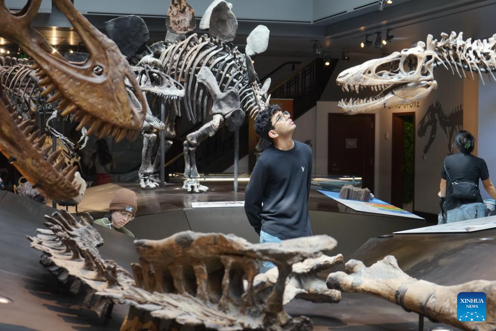 A visitor views dinosaur fossils at the Natural History Museum of Los Angeles County during the 10th annual Dino Fest in Los Angeles, the United States, Sept. 14, 2025. (Photo by Zeng Hui/Xinhua)