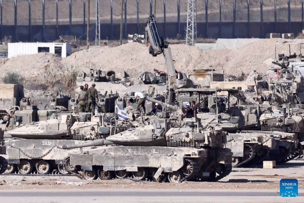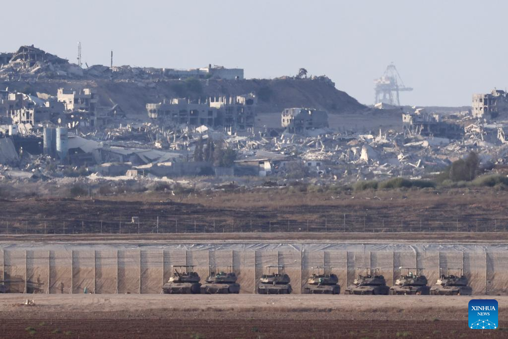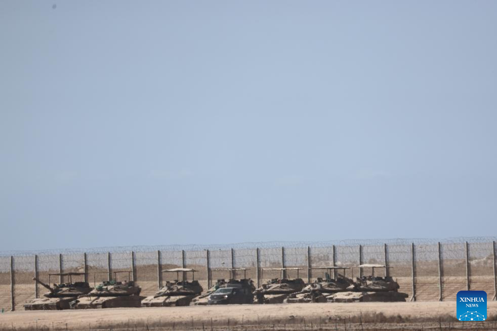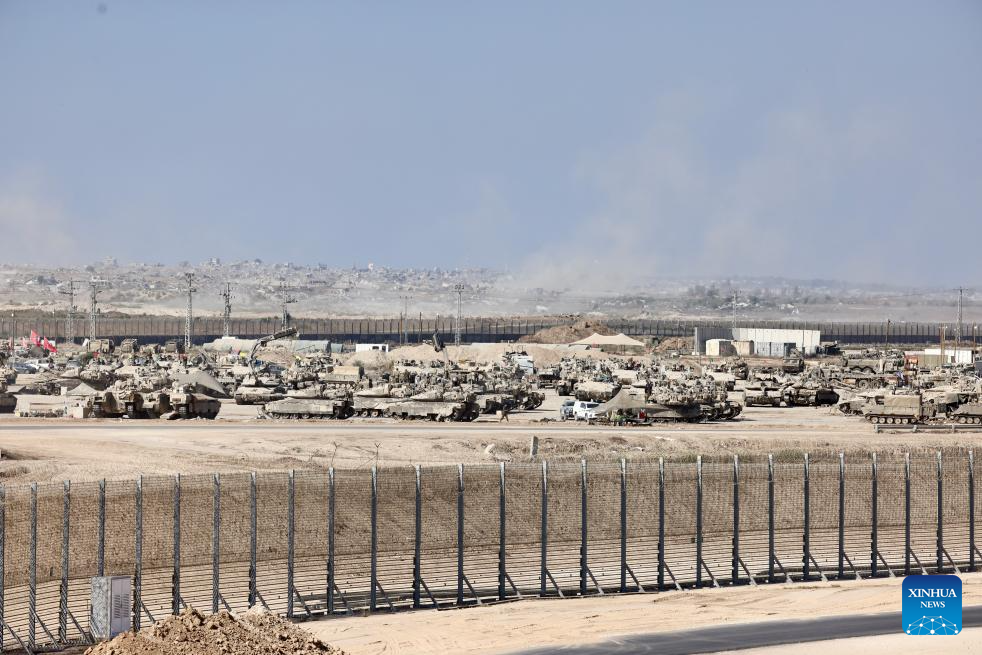 Israeli military vehicles are seen near the southern Israeli border with Gaza, Sept. 16, 2025. Israel's military said on Tuesday it launched a "large-scale ground operation" in Gaza City overnight, as local officials reported heavy strikes in the enclave's biggest urban center that left dozens dead or missing. (Photo by Jamal Awad/Xinhua)
