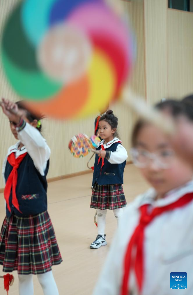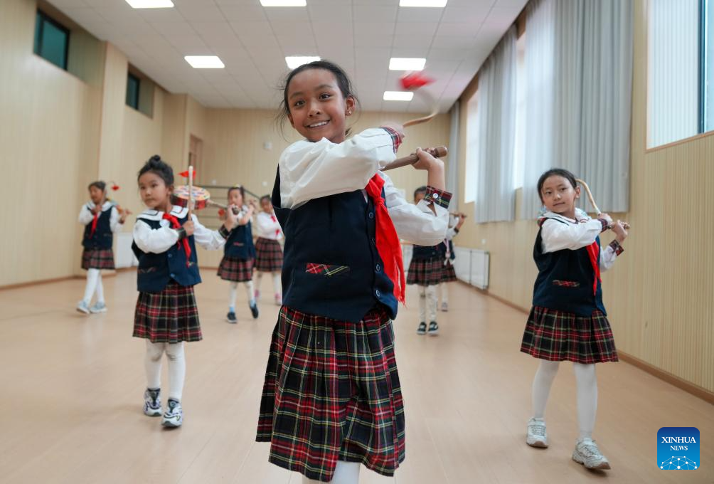 Students practice Reba Dance at Lhasa Experimental Primary School in Lhasa, southwest China's Xizang Autonomous Region, Sept. 11, 2025. Reba Dance is a form of drum dance, and a blend of performing arts, integrating storytelling, singing, dancing and acrobatics. In 2006, it was included in the first batch of China's national intangible cultural heritage list.(Xinhua/Jigme Dorje)