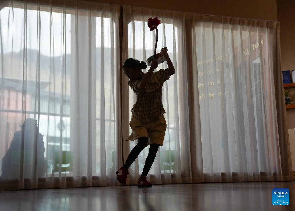 A student practices Reba Dance at an aesthetic education center in Lhasa, southwest China's Xizang Autonomous Region, Sept. 13, 2025. Reba Dance is a form of drum dance, and a blend of performing arts, integrating storytelling, singing, dancing and acrobatics. In 2006, it was included in the first batch of China's national intangible cultural heritage list.(Xinhua/Jigme Dorje)