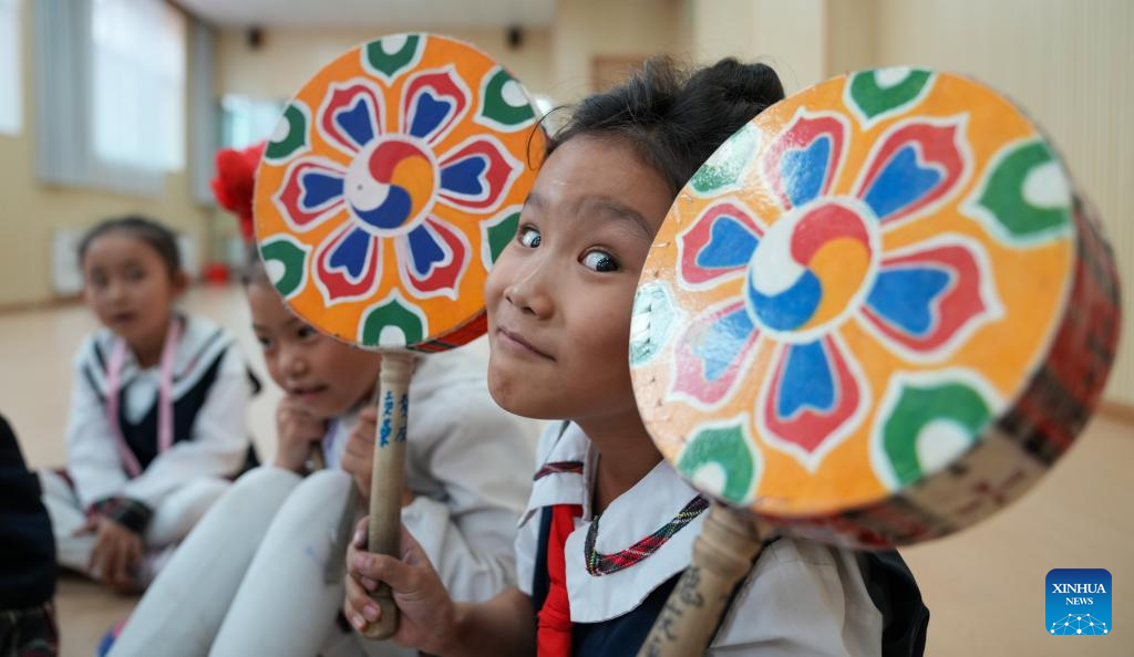 A child holds Reba drums for Reba Dance, at Lhasa Experimental Primary School in Lhasa, southwest China's Xizang Autonomous Region, Sept. 11, 2025. Reba Dance is a form of drum dance, and a blend of performing arts, integrating storytelling, singing, dancing and acrobatics. In 2006, it was included in the first batch of China's national intangible cultural heritage list.(Xinhua/Jigme Dorje)