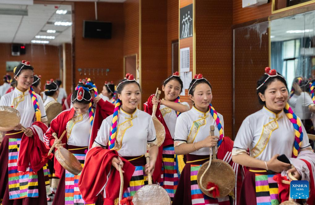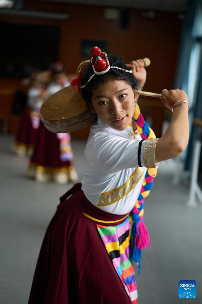 Students practice Reba Dance at the No. 2 secondary vocational and technical school of Lhasa, southwest China's Xizang Autonomous Region, Sept. 9, 2025. Reba Dance is a form of drum dance, and a blend of performing arts, integrating storytelling, singing, dancing and acrobatics. In 2006, it was included in the first batch of China's national intangible cultural heritage list.(Xinhua/Jigme Dorje)