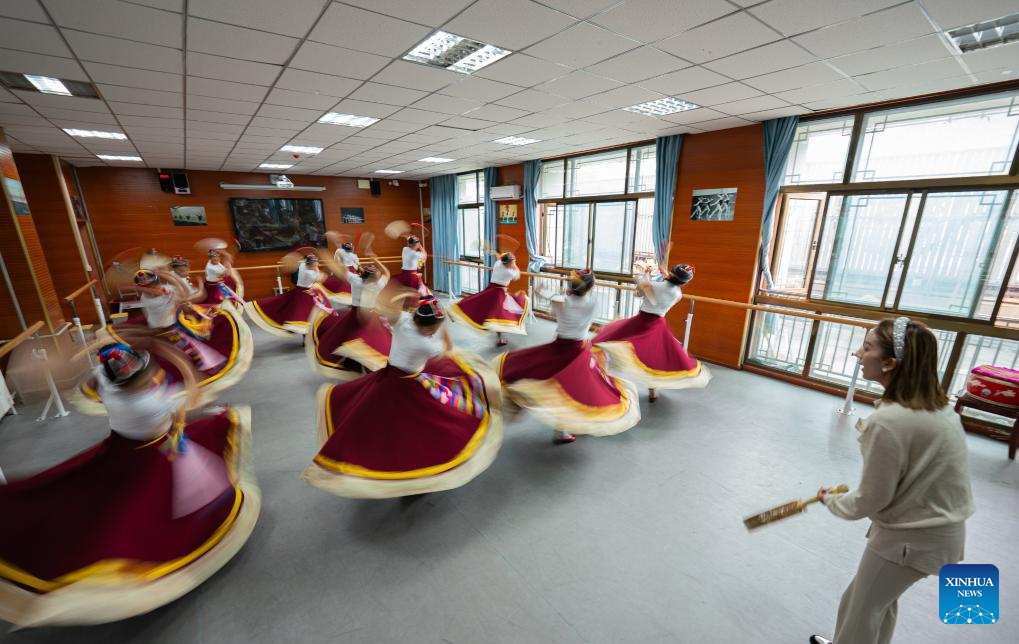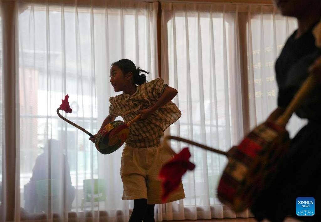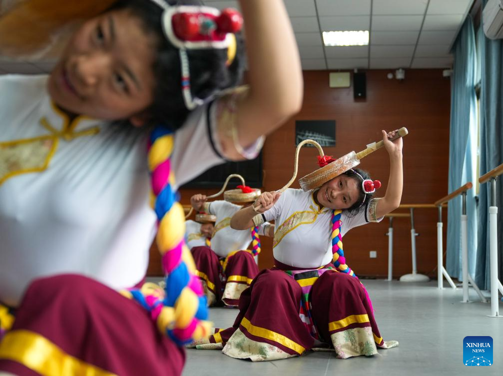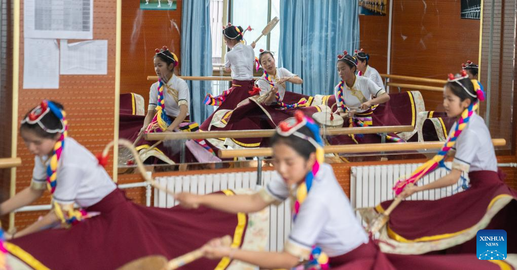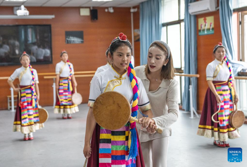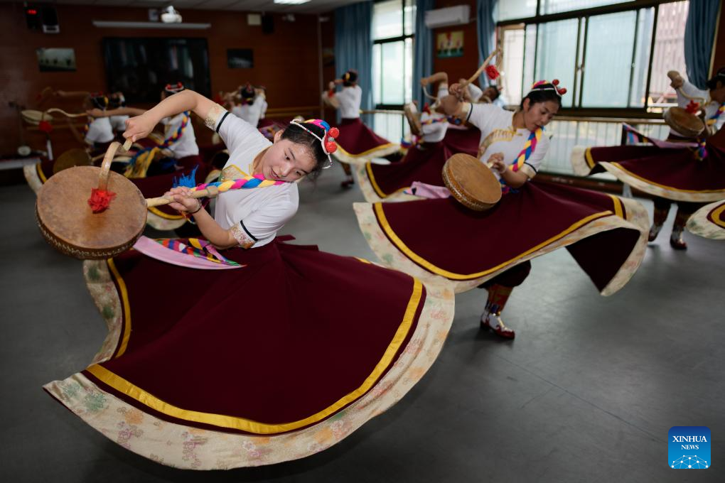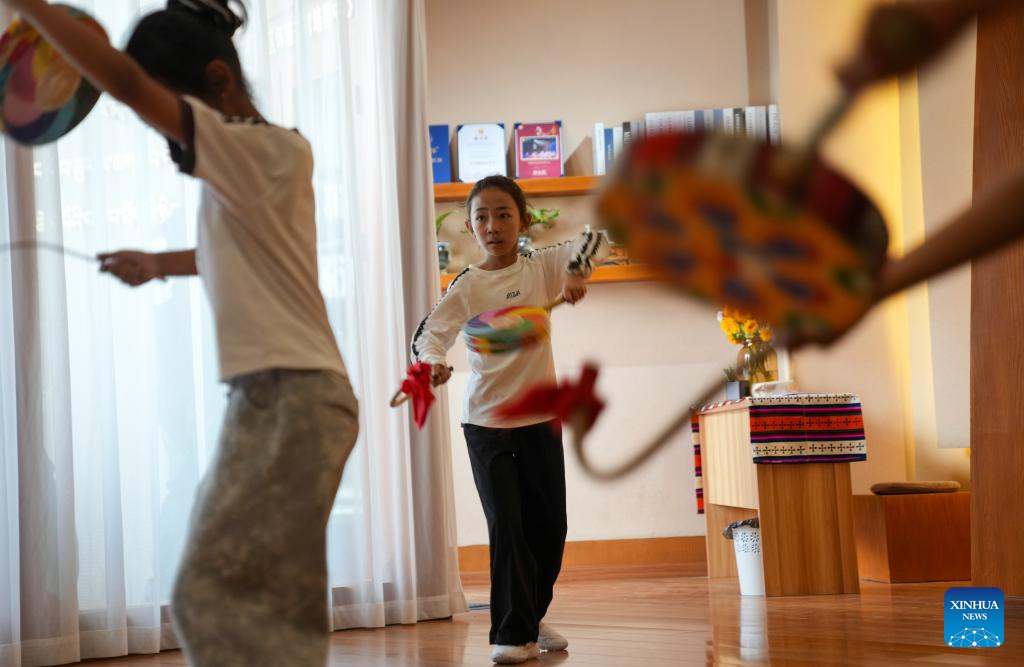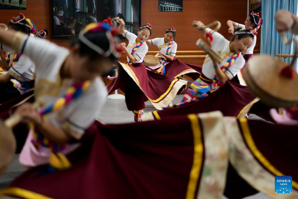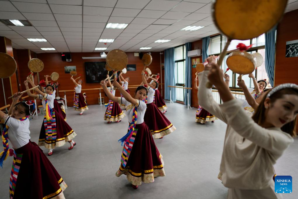 Students practice Reba Dance at an aesthetic education center in Lhasa, southwest China's Xizang Autonomous Region, Sept. 13, 2025. Reba Dance is a form of drum dance, and a blend of performing arts, integrating storytelling, singing, dancing and acrobatics. In 2006, it was included in the first batch of China's national intangible cultural heritage list.(Xinhua/Jigme Dorje)