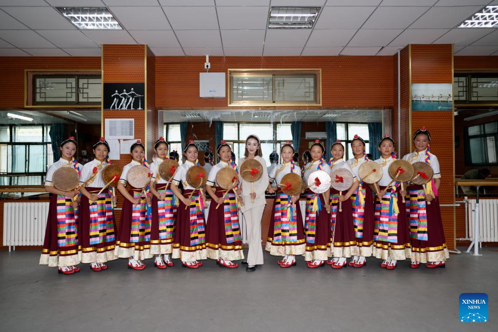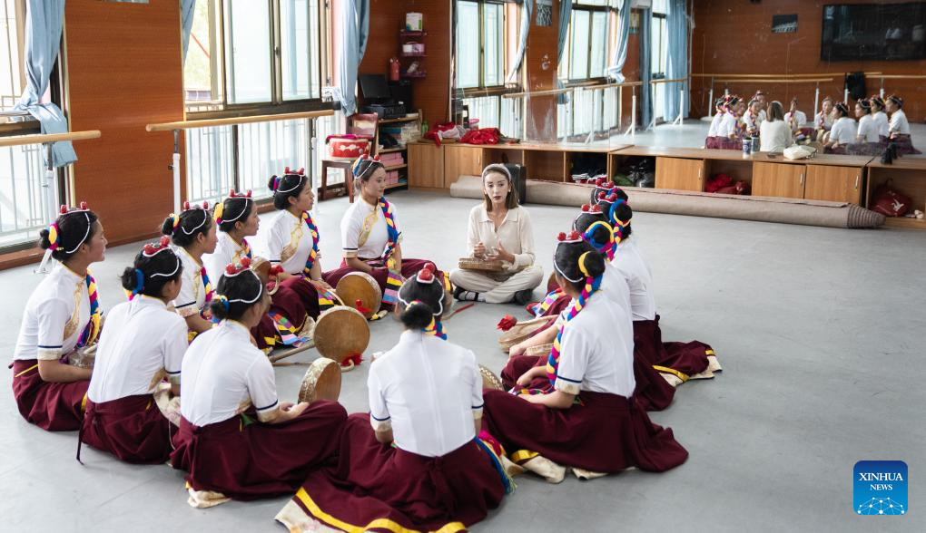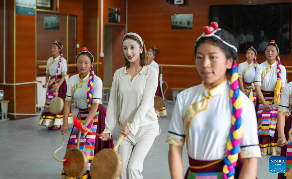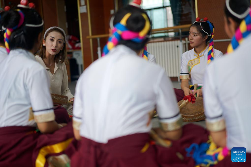 Teacher Nyima Drolma (2nd R) guides a student on practicing Reba Dance at the No. 2 secondary vocational and technical school of Lhasa, southwest China's Xizang Autonomous Region, Sept. 9, 2025. Reba Dance is a form of drum dance, and a blend of performing arts, integrating storytelling, singing, dancing and acrobatics. In 2006, it was included in the first batch of China's national intangible cultural heritage list.(Xinhua/Tenzin Nyida)