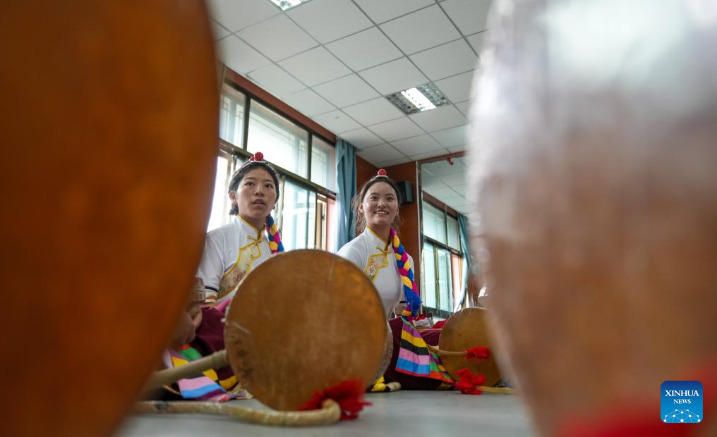 Students take a break during a practice of Reba Dance at the No. 2 secondary vocational and technical school of Lhasa, southwest China's Xizang Autonomous Region, Sept. 9, 2025. Reba Dance is a form of drum dance, and a blend of performing arts, integrating storytelling, singing, dancing and acrobatics. In 2006, it was included in the first batch of China's national intangible cultural heritage list.(Xinhua/Jigme Dorje)