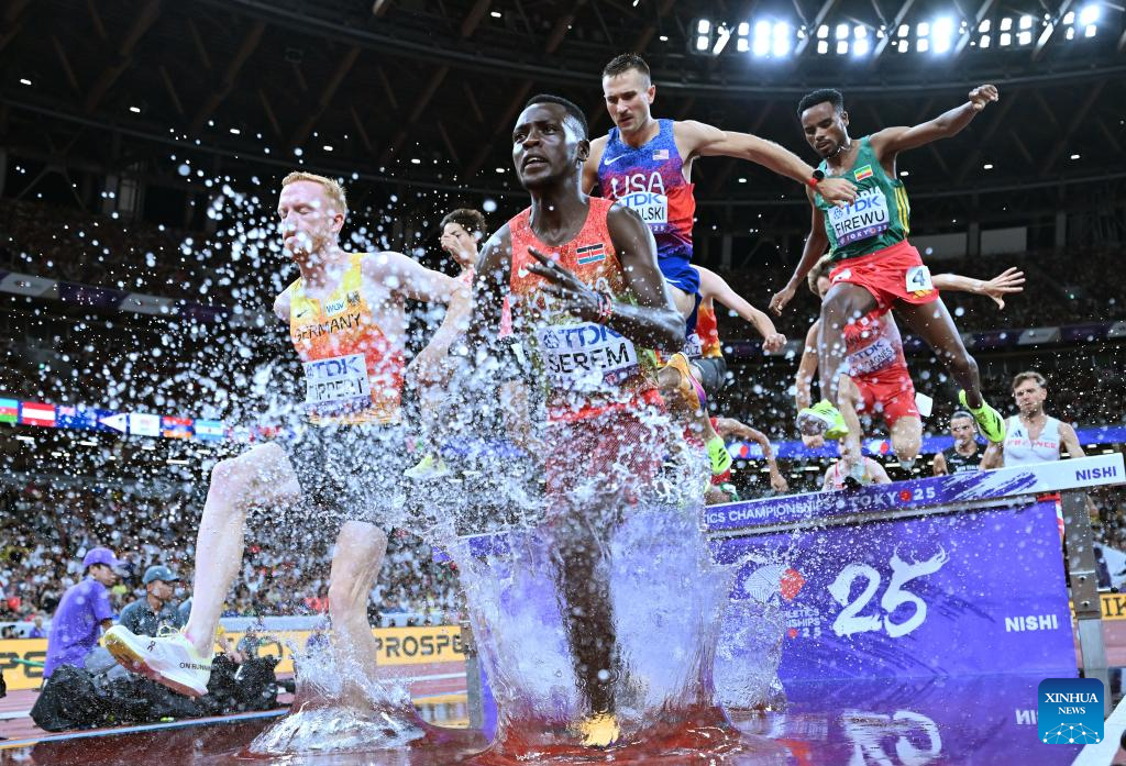 Edmund Serem (1st R) of Kenya competes during the men's 3000m steeplechase final at the 2025 World Athletics Championships in Tokyo, Japan, Sept. 15, 2025. (Xinhua/Jia Haocheng)