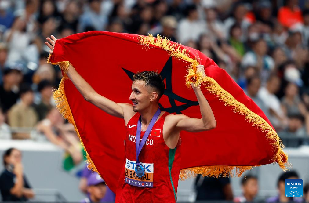 Silver medalist Soufiane El Bakkali of Morocco celebrates after the men's 3000m steeplechase final at the 2025 World Athletics Championships in Tokyo, Japan, Sept. 15, 2025. (Xinhua/Wang Lili)