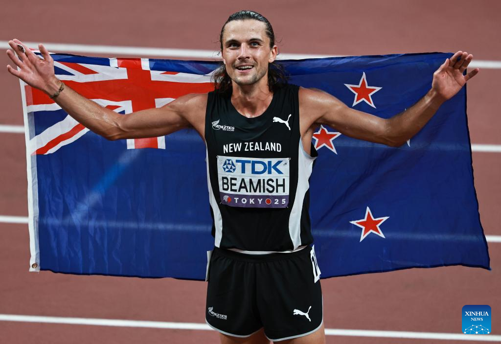 Gold medalist Geordie Beamish of New Zealand celebrates after the men's 3000m steeplechase final at the 2025 World Athletics Championships in Tokyo, Japan, Sept. 15, 2025. (Xinhua/Jiang Han)