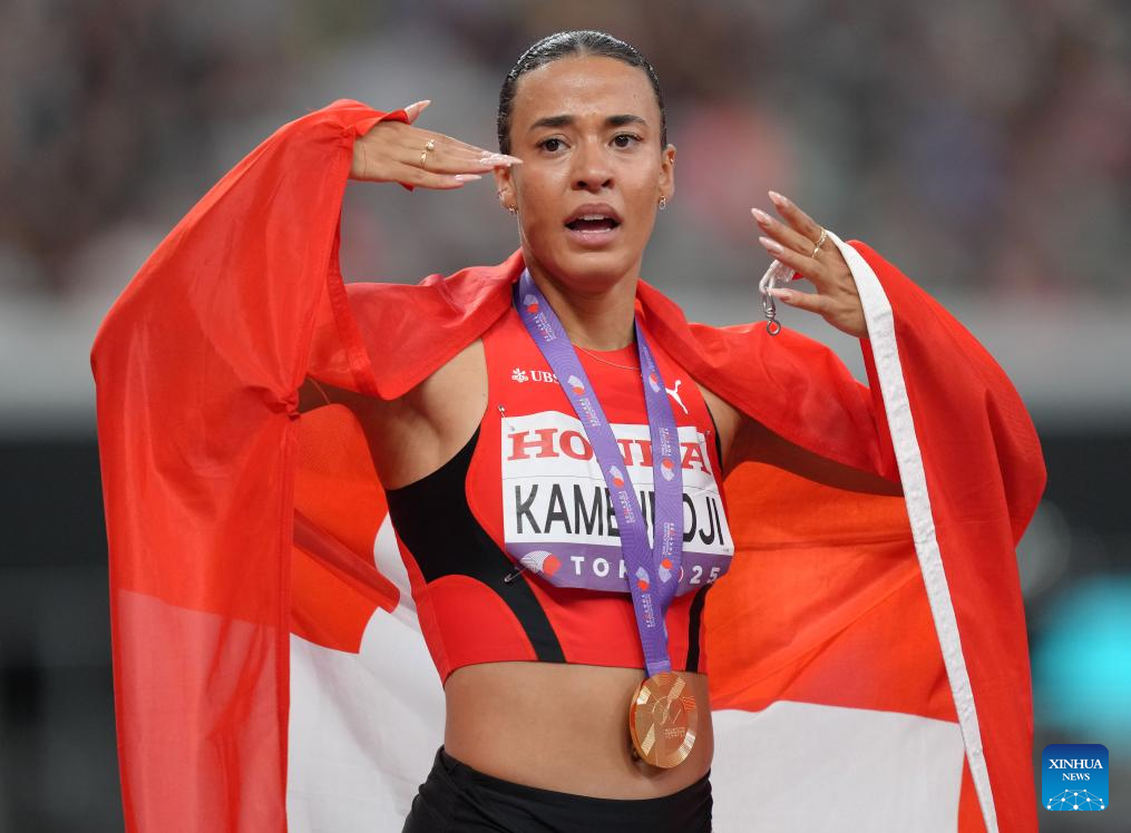 Gold medalist Ditaji Kambundji of Switzerland reacts after the women's 100m hurdles final at the 2025 World Athletics Championships in Tokyo, Japan, Sept. 15, 2025. (Xinhua/Jia Haocheng)