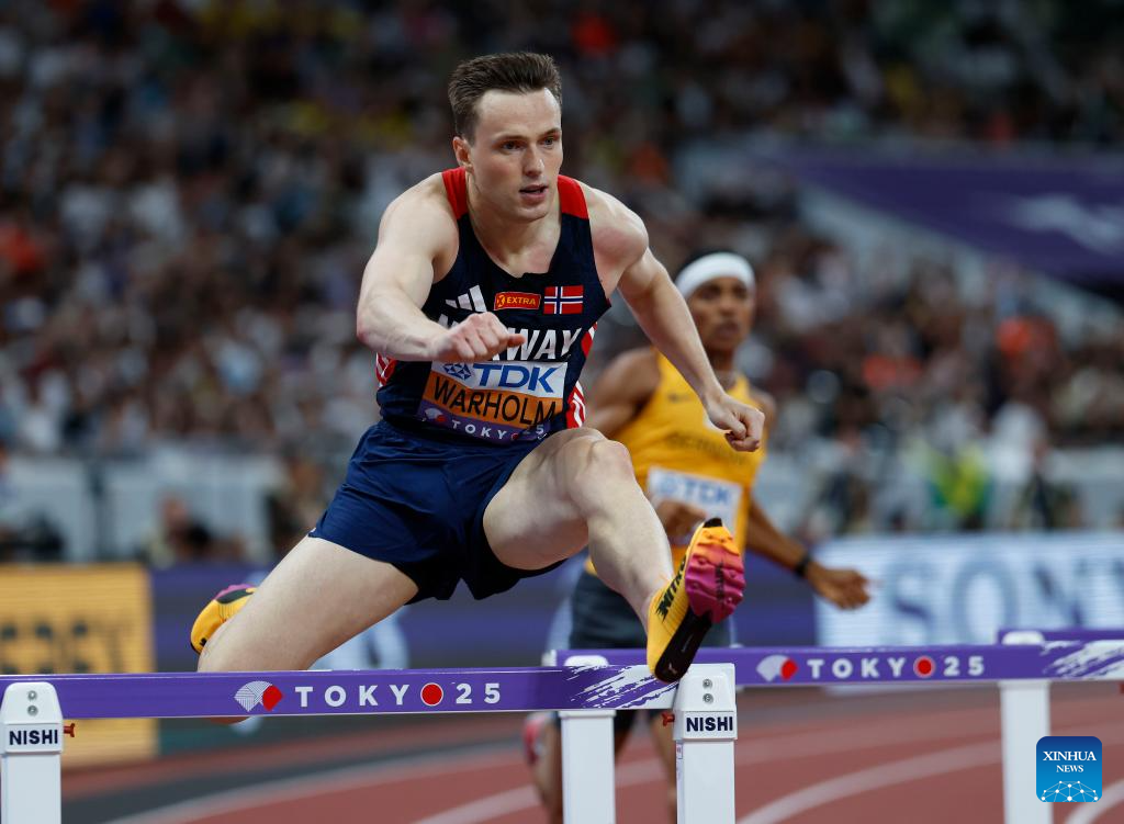 Karsten Warholm of Norway competes during the men's 400m hurdles heats at the 2025 World Athletics Championships in Tokyo, Japan, Sept. 15, 2025. (Xinhua/Wang Lili)
